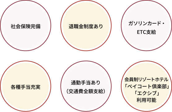 | 休 日 休 暇 | 週休2日制 ※現場によって変動あり ■年間休日 120 日 ■長期連休制度あり ・GW ・夏季休暇 ・年末年始休暇 |